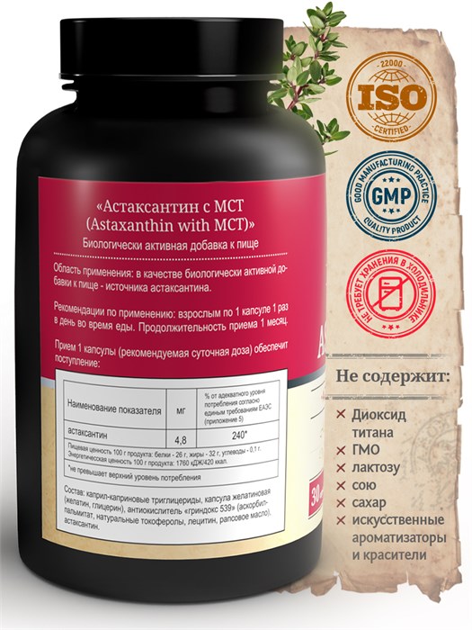 Астаксантин – [указать дозировку, например: 4–8 мг] в одной капсуле.
