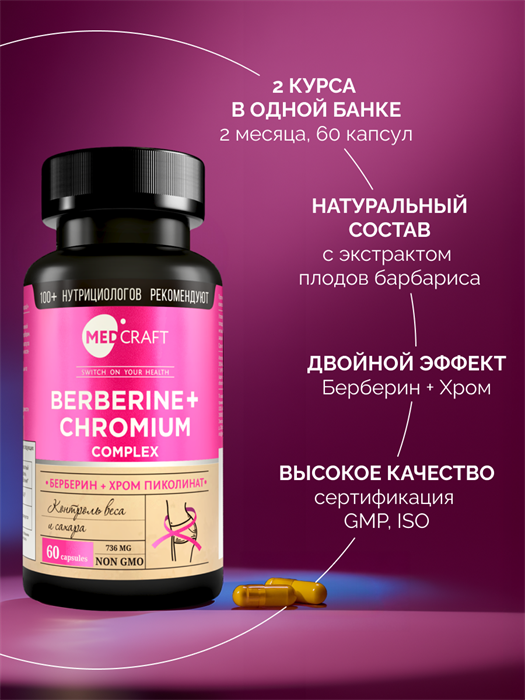 MedCraft Берберин + Хром, капсулы 760 мг – это БАД для нутритивной поддержки углеводного обмена, пищевых привычек и общего метаболического комфорта.