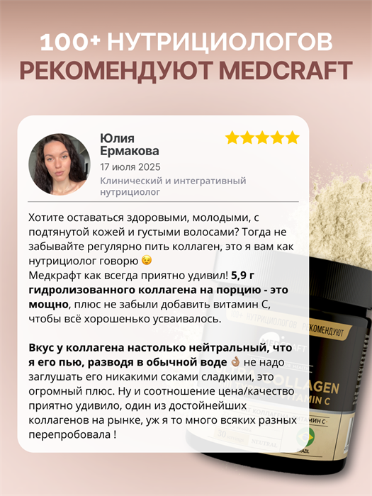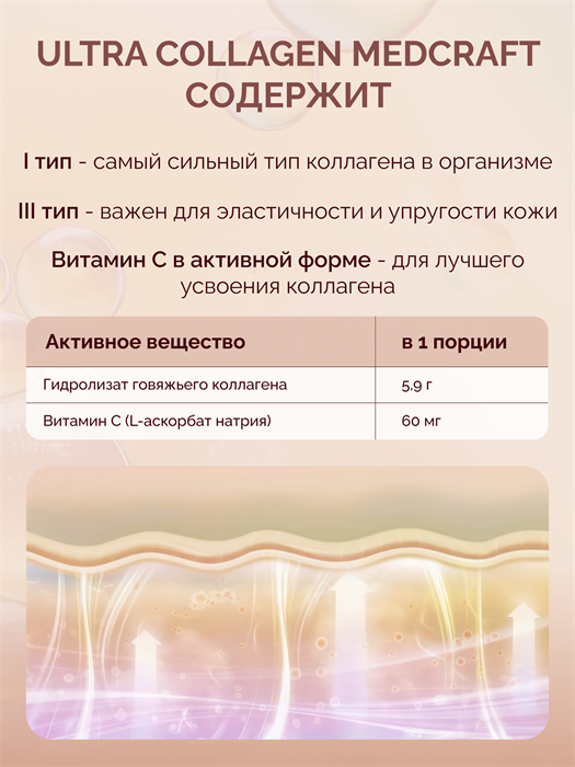 Витамин C усиливает направленность продукта на поддержку коллагенового каркаса, участвуя в процессах образования собственного коллагена. MedCraft