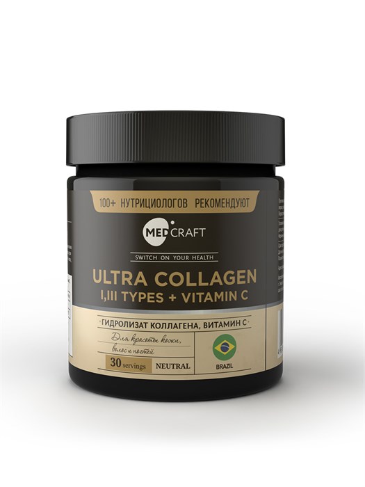 MedCraft Ultra Collagen (говяжий коллаген I и III типа с витамином C), порошок, 180 г – это биологически активная добавка для нутритивной поддержки соединительной ткани, кожи, суставов, волос и ногтей.