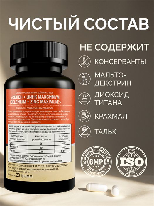 Цинк, селен с витамином С это комплексная добавка, объединяющая три мощных антиоксиданта и иммуномодулятора в одной формуле.
