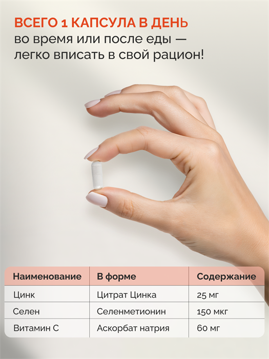 В 1 порции (1 капсула) содержится: цинк 25 мг, селен 150 мг, витамин С (аскорбат натрия) 60 мг