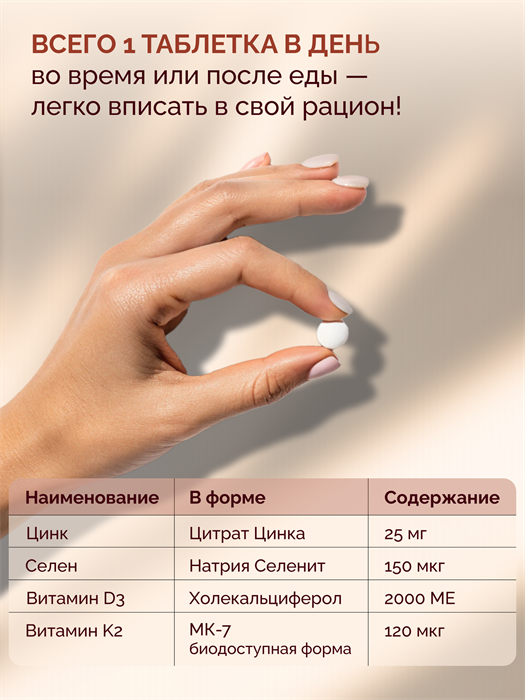 Центральный компонент этого комплекса - цинк, который играет важную роль в процессе восстановления тканей, укрепления иммунной системы и регулирования уровня гормонов. Селен также является ключевым элементом для поддержания здоровья сердечно-сосудистой системы и защиты клеток от оксидативного стресса. Витамин D3 помогает укрепить кости и зубы, а также повышает уровень энергии и настроение. Витамин K2 (МК-7) способствует укреплению связок и суставов, а также снижает риск развития сердечно-сосудистых заболеваний.