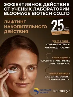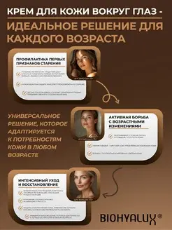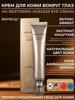Лифтинг-крем для глаз с гиалуроновой кислотой. Идеальный помощник в борьбе с признаками старения кожи вокруг глаз. Этот инновационный лифтинг-крем создан для интенсивного ухода за чувствительной кожей, учитывая все основные возрастные изменения и специфические потребности в увлажнении, восстановлении и защите. Его уникальная формула сочетает в себе передовые достижения косметологии и дерматологии, обеспечивая максимальную эффективность. Крем имеет нежную и шелковистую текстуру, легко впитывается, не оставляя ощущения липкости, идеально подходит под макияж. При регулярном использовании Biohyalux HA Restoring Ageless Eye Cream (всего за 28 дней) вы заметите видимое разглаживание морщин, повышение упругости и эластичности кожи.