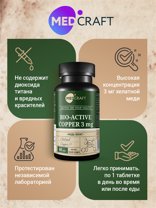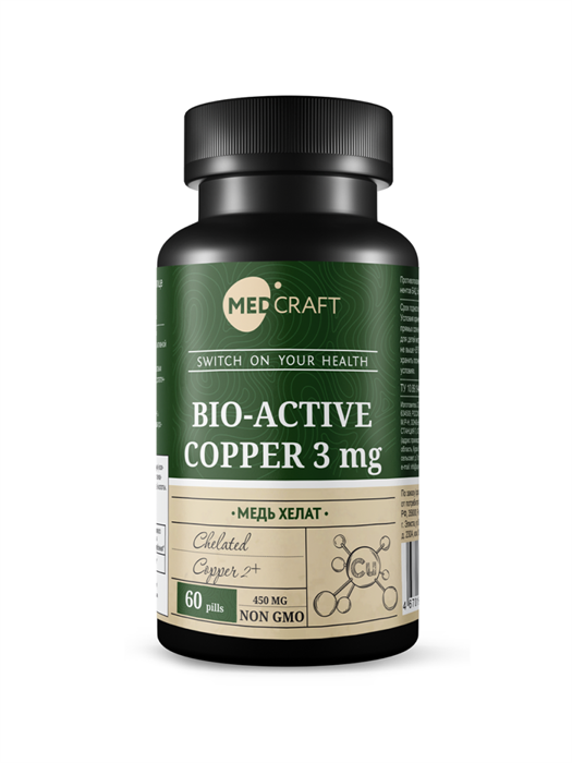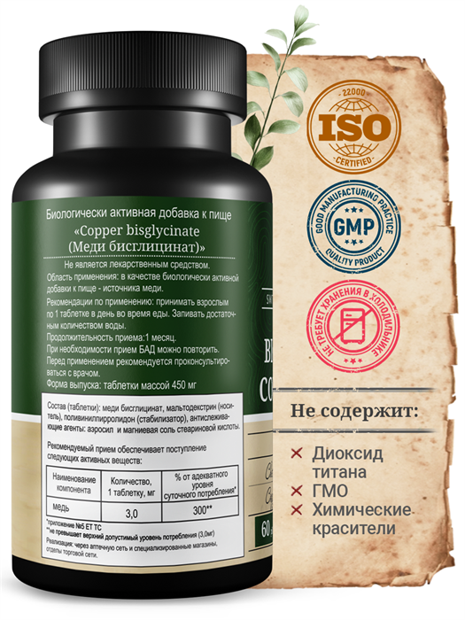 Медь в хелатной форме (медь бисглицинат) – 3 мг в одной таблетке.