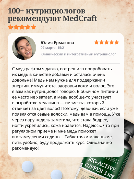 В одной таблетке содержится 3 мг меди – удобный формат для включения в ежедневный рацион по рекомендации специалиста.