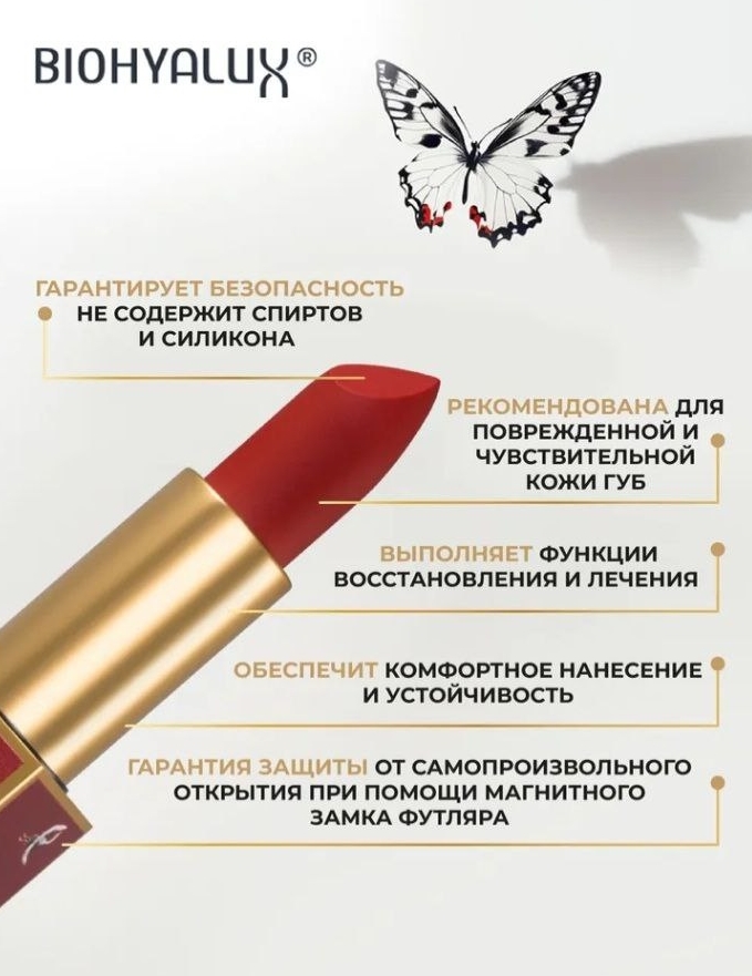 — Стойкий сатиновый финиш с легкой текстурой — не стирается и не сушит губы.