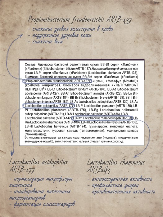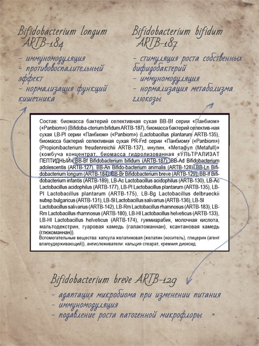 Полный перечень штаммов, их количество (КОО/капсула) и вспомогательные вещества указаны на упаковке.